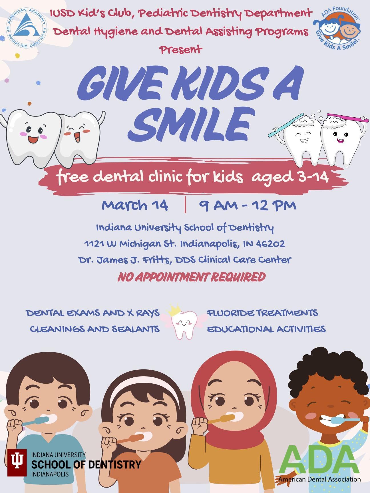 Reminder for our families! The Indiana University School of Dentistry is hosting Give Kids a Smile, a special event providing FREE dental screenings, x-rays, cleanings, and sealants for children ages 3–14.
